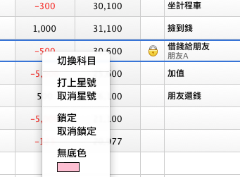 鎖定後的紀錄無法編輯及刪除,必須解除鎖定才能再編輯,可用來避免不小心修改到之前的紀錄而導致金額錯亂的情況